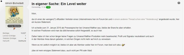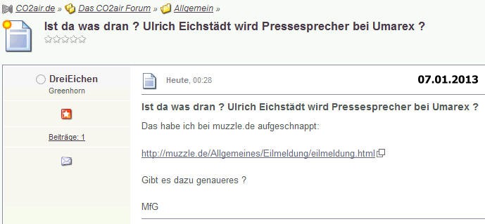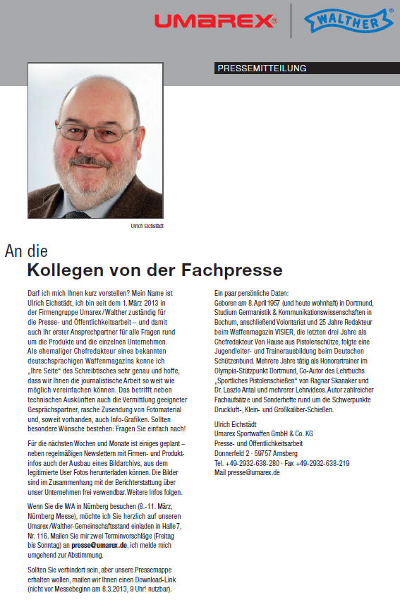 Pressesprecherstelle bei “UMAREX/Walther” entfällt? Aus bei UMAREX: Ulrich Eichstädt scheidet zum 31. Januar 2018 als Pressesprecher bei “UMAREX/Walther” aus und äußert sich am 09.11.2017 dazu im “co2air”-Board wie folgt: Moin, (Zitatende) Wie Ulrich Eichstädt exklusiv gegenüber “muzzle.de” erklärt, entfällt die 2013 extra für ihn geschaffene Pressesprecherstelle ersatzlos. Einen Nachfolger auf dieser Position wird es somit nicht geben. Ich habe die Aussage mit einiger Verwunderung zur Kenntnis genommen, dass die Führung eines global operierenden, prominenten Unternehmens wie „UMAREX/Walther“ eine repräsentative Pressesprecherstelle grundsätzlich als verzichtbar erachtet. Man wird dort aber sicher Gründe dafür haben. GUNIMO, 17.12.2017