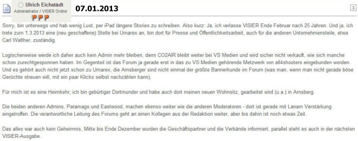 Meldung, 4.1.2013 Neuer Pressesprecher bei UMAREX Wie aus für gewöhnlich gut unterrichteten Kreisen glaubhaft verlautet, hat sich der erfolgreiche Arnsberger Sportwaffenhersteller UMAREX zukünftig die Dienste des derzeitigen VISIER-Chefredakteurs Ulrich Eichstädt (im Bild unten, rechts) als neuen Pressesprecher und Repräsentanten des Unternehmes gesichert. Eine entsprechende Verlautbarung oder Bestätigung dieser Personalie ist von offizieller Seite bislang allerdings nicht erfolgt. Sollte sich die Meldung offiziell verifizieren, wird es sowohl im Bezug auf die Öffentlichkeitsarbeit des sauerländischen Unternehmens, als auch auf die weitere Entwicklung des von der “VISIER” Fachzeitschriften-Redaktion betriebenen Internetforums für Freie Waffen “co2air.de” (Leitung/Admin. U. Eichstädt) ein spannendes Jahr 2013. U. Eichstädt hatte gemeinsam mit M. Recktenwald (Foto oben) erst seit Mitte 2010 die Doppelspitze der VISIER-Redaktion gebildet und agiert als Online-Redakteur (Moderator) auch bei „waffen-online“, wo das VISIER-Forum seit langem als Unterforum etabliert ist. 2012 feierte VISIER sein 25-jähriges Jubliläum, UMAREX blickt bereits auf sein 40-jähriges Bestehen zurück.