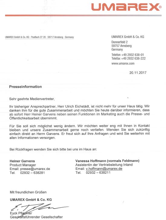 Pressemitteilung UMAREX 20.11.2017 zur Interimslösung bezüglich der Pressesprecherstelle: