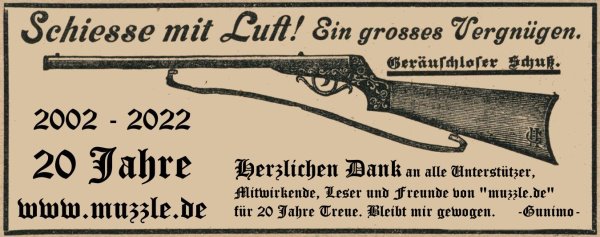 ”muzzle.de” musste wegen eines Programmdefektes und gleichzeitigem Update von “NOF5” auf Version “NOF7” komplett neu aufgesetzt und verlinkt werden (Dez.2003/ Jan.2004). Mein besonderer Dank gilt an dieser Stelle “GunMax”, “Omega Match” und “ManEater” für den freundlichen und sehr hilfreichen Support bei der Umstrukturierung dieser Präsenz, die nun aus 7 Einzelprojekten besteht! GUNIMO