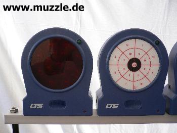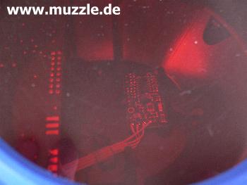 Bild unten links: Blick durch die Trefferscheibe auf die Elektronik des Multifunktionszieles. Hier erkennt man