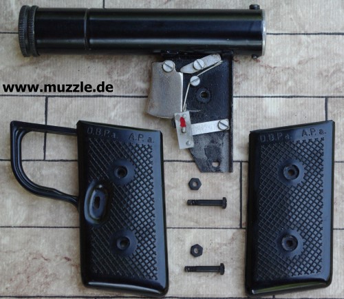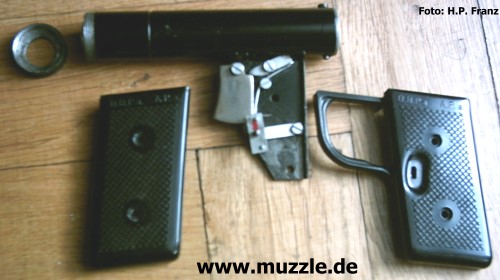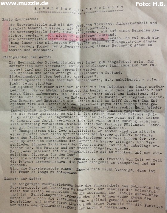Eine Meisterleistung deutscher Ingenieurskunst: Genial einfach, einfach genial und dabei so wirkungsvoll. ;-) Technische Daten und Funktion: Maße: 115 x 100 x 20 Gewicht: ca. 150 g Beschriftung: “D.B.P.a.” und “A.P.a.” (auf beiden Griffschalen) Typ: Federdruckwaffe, Einzellader Munition: chemischer Wirkstoff / Kampfstoffampullen (ca. 20 ml Inhalt) Wirkung: ätzender chemischer Stoff, der Atemnot, Tränenbildung mit vorübergehender Sehbehinderung und Reizung/Entzündung der Schleimhäute auslöst Reichweite: bis zu ca. 6 m Wirkung, empfohlene Schussentfernung max. 3 m (“Nahkampf”) Abzussicherung: Blockierschieber an der linken Griffschale Bauteile: Lauf, Bolzen, Schlagbolzenfeder, Schraubgewindering (Laufmündung), Griffstück mit Abzugseinheit und Sicherung, Griffschalen (linke Schale mit Bügel) Lieferumfang: Holzladestock als Spann-/Entspannhilfe, Wirkstoffpatronen (Ampullen rot gekennzeichnet), Übungspatrone (zum Füllen mit Wasser), Bedienungsanleitung (Gebrauchsinstruktion)