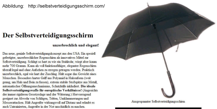 Selbstverteidigung mit Schirm oder Spazierstock Selbstverteidigung, ein Thema, fast so alt wie die Menschheit. Ein Thema, mit dem sich wohl (fast) jeder mal irgendwann in seinem Leben mehr oder weniger intensiv befasst. Der einschlägige Fachhandel bietet dazu eine Vielzahl an speziellen Produkten an: Schreckschusswaffen (früher als „Scheintod-Pistolen“ bezeichnet), Gas-/ Pfeffersprays, Elektroschocker, spezielle Hiebwaffen wie Teleskopschlagstöcke oder Tonfas, akustische Alarmsignalgeber und sonstiges Allerlei an mehr oder weniger gut geeigneten Hilfsmitteln. Equipment, welches gemäß Produktwerbung dazu im Stande sein soll, Aggressoren (hoffentlich) wirksam in die Flucht zu schlagen, ist praktisch in jeder Preisklasse zu erwerben. In den meisten Fällen ist es aber sehr ratsam, die im jeweiligen Zusammenhang geltenden, aktuell gültigen Rechtsvorschriften im Auge zu behalten und natürlich auch zu befolgen! Puristen setzen da lieber auf die Stärkung des Selbstbewusstseins durch das Erlernen von Nahkampftechniken, von denen es eine Vielzahl an meist fernöstlich geprägten Spielarten gibt. Hier werden sozusagen Arme und Beine durch entsprechend aufwändiges Körpertraining zu „Waffen“ herangebildet. Eine gewisse Sportlichkeit, oder zumindest doch Freude an Körperertüchtigung, sollte der geneigte Kampfsportlehrling aber schon mitbringen. Nur ausreichend viel Training macht auch hier den Meister. Manche schwören dann auf ganz defensives Verhalten und raten dem Attackierten ganz einfach zum Entziehen durch Flucht. Schnelle Beine können dann natürlich nicht schaden. Allerdings, nicht jeder ist körperlich zum Spurten in der Lage, bzw. nicht jede kritische Situation lässt sich so vermeiden. Auch wenn deeskalierendes Verhalten in kritischen Situationen grundsätzlich angesagt ist, lässt sich eine handfeste Auseinandersetzung manchmal eben nicht mehr verhindern. Die Gewaltbereitschaft in der Gesellschaft und die Brutalität, mit der bei Übergriffen vorgegangen wird, hat unbestreitbar zugenommen. Dabei werden mittlerweile oft auch die letzten Hemmungs- und Respektgrenzen überschritten. Selbst behinderte und alte Menschen finden keine Gnade, werden angepöbelt, niedergeschlagen, mit Messern attackiert und ausgeraubt. Gut in Erinnerung sind wohl den meisten noch die von Überwachungskameras aufgezeichneten Übergriffe brutaler Schläger gegen Fahrgäste und Passanten an S-Bahn- und U-Bahn-Stationen verschiedener deutscher Großstädte. Die exzessive Gewalt, die sich u. a. mit wuchtigen Tritten gegen Kopf und Körper bereits am Boden liegender wehrloser Opfer entlud, hat selbst hart gesottene Zeitgenossen schockiert. Ein Rentner in München überlebte die dabei erlittenen schwersten Kopfverletzungen nur durch sehr viel Glück. Er hatte es doch tatsächlich „gewagt“, zwei Jugendliche im S-Bahn-Abteil auf das dort geltende Rauchverbot hinzuweisen. Viele ältere Menschen sind längst besorgt ob ihrer Sicherheit, mancher traut sich nur noch mit mulmigem Gefühl im Bauch und nicht mehr ohne Begleitung auf die Straße, vor allem bei Dunkelheit. Doch aufgemerkt: Manche ergeben sich nicht hilflos dieser Situation, sondern lernen, einen mitgeführten Sparzierstock oder Stockschirm als Waffe einzusetzen.