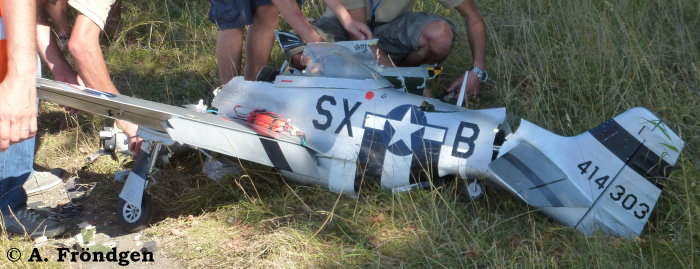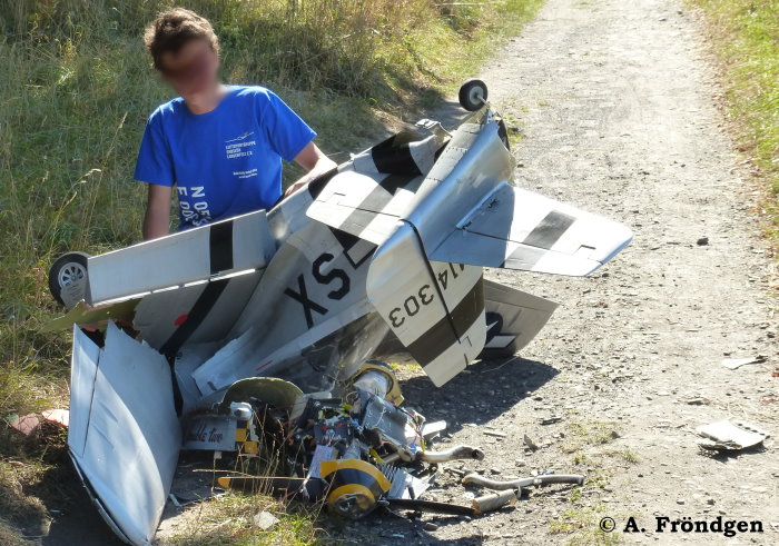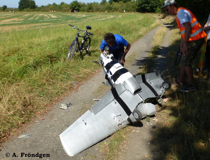 Typ “Mustang” zerschellte auf den Feldweg am Rande des Rollfeldes. Zum Glück wurde niemand verletzt! Der Weg wird von vielen Spaziergängern und Radfahrern genutzt und war aufgrund der Flugschau an diesem Tage besonders stark
