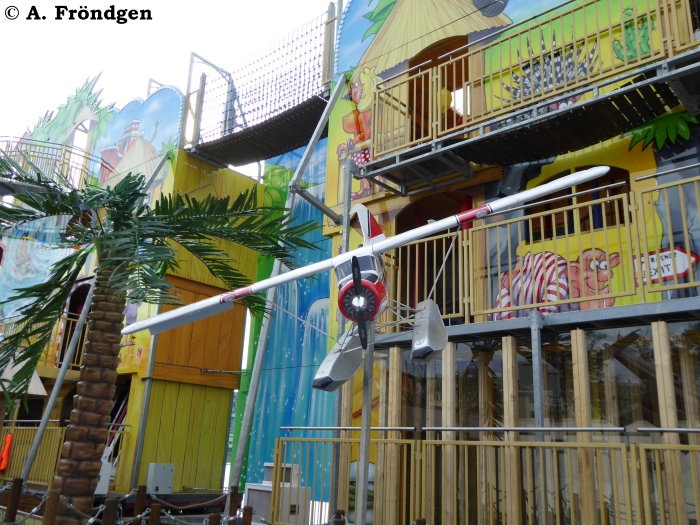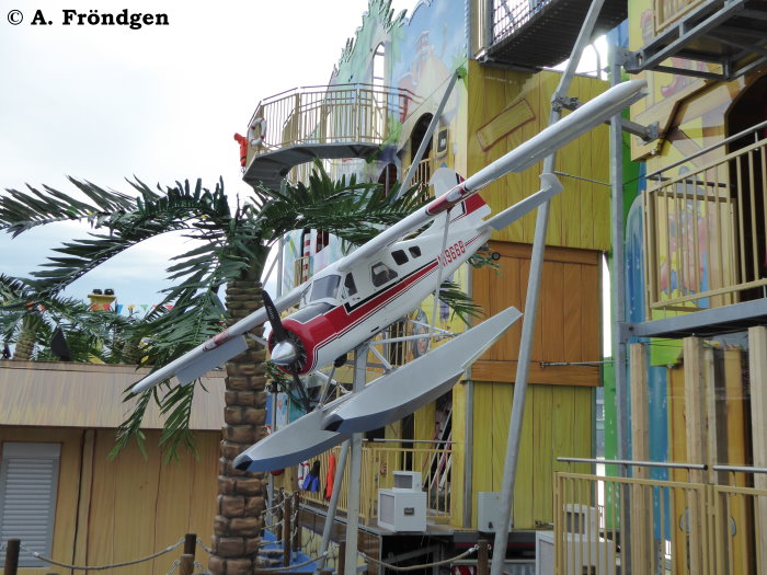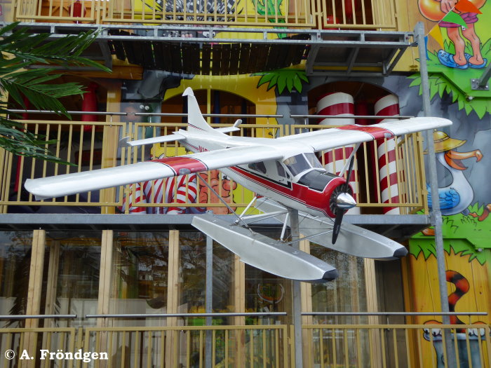 Wasserflugzeug-Modell “Hangar 9 DHC-2 Beaver 30 cc ARF” (N-19668) hängt als Dekoration an der Fassade eines Fahrgeschäfts: