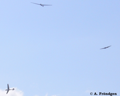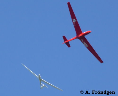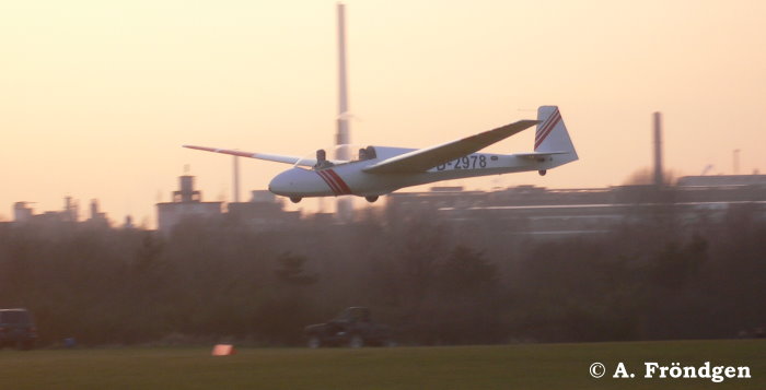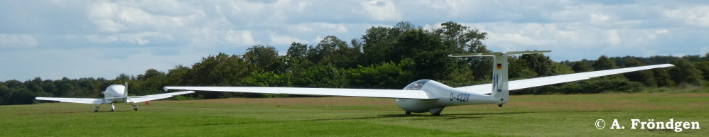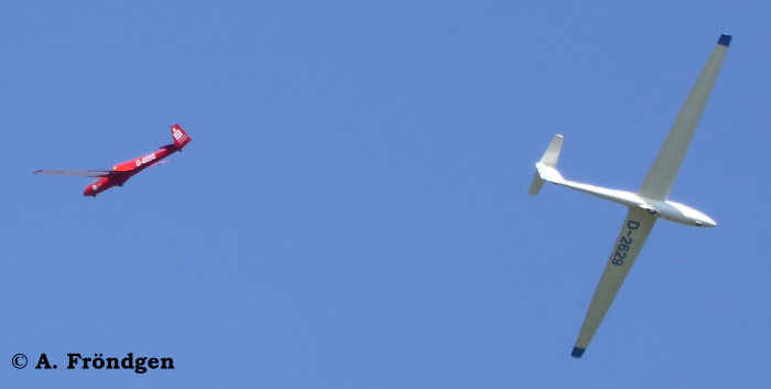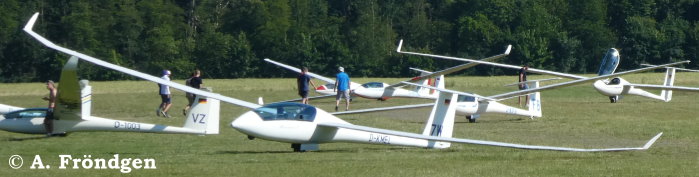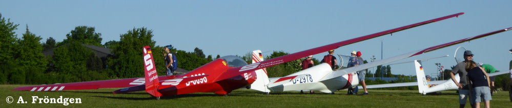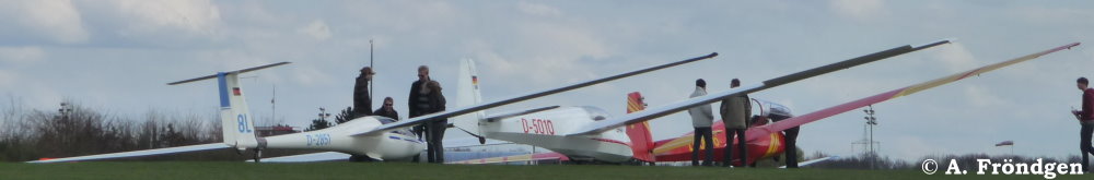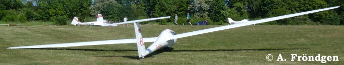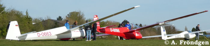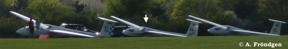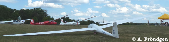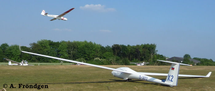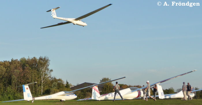 “Schleicher ASK-21” (D-2629) überfliegt landend die wartenden “Rolladen-Schneider LS4” (D-2851), “Schleicher ASK-13” (D-2978) und “Duo Discus” (D-8291)