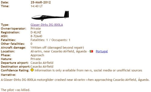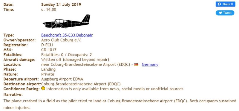 2007 -  Bei einer Außenlandung auf einem Feld bei Leverkusen-Steinbüchel kollidiert die Pilotin mit einem Traktor und erleidet dabei leichte Verletzungen