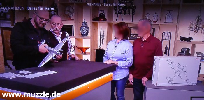 “Märklin”-Modell der “JU-AIR”, HB-HOS (A-701), bei “Bares für Rares” (ZDF), mit Sven Deutschmanek (ganz links) und Horst Lichter, Sendungsausstrahlung März 2020