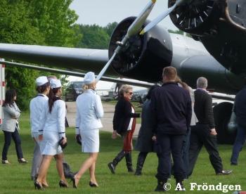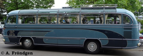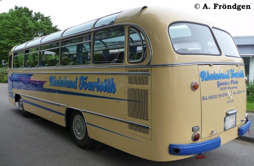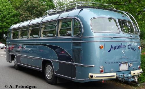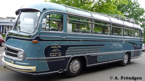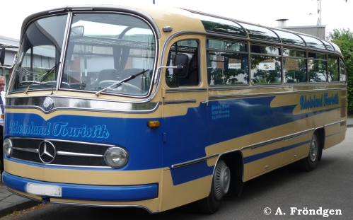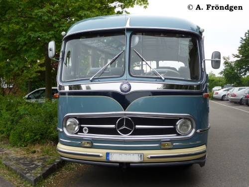 Die Fluggäste wurden stilecht mit “Mercedes-Benz”-Oldtimer-Bussen aus den 1960er Jahren zum Flugplatz gebracht. Bei dem blauen Bus mit Dachgepäckreling handelt es sich um einen Bus vom Typ “Mercedes-Benz”, Modell ”0321 H” (Überlandausführung) mit 38 Sitzplätzen aus Baujahr 1960 im restaurierten Originalzustand. Das Modell wurde von 1954 bis 1964 gebaut.
