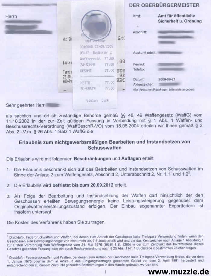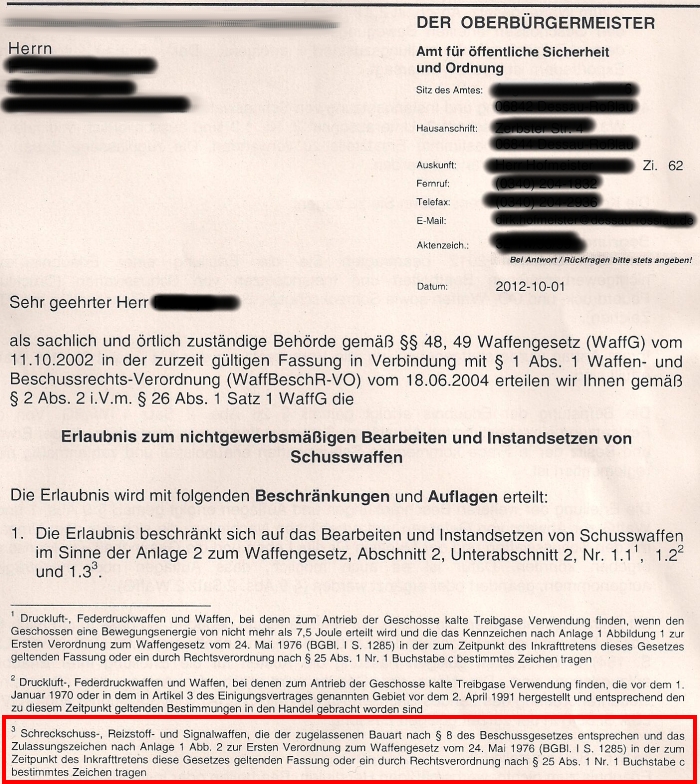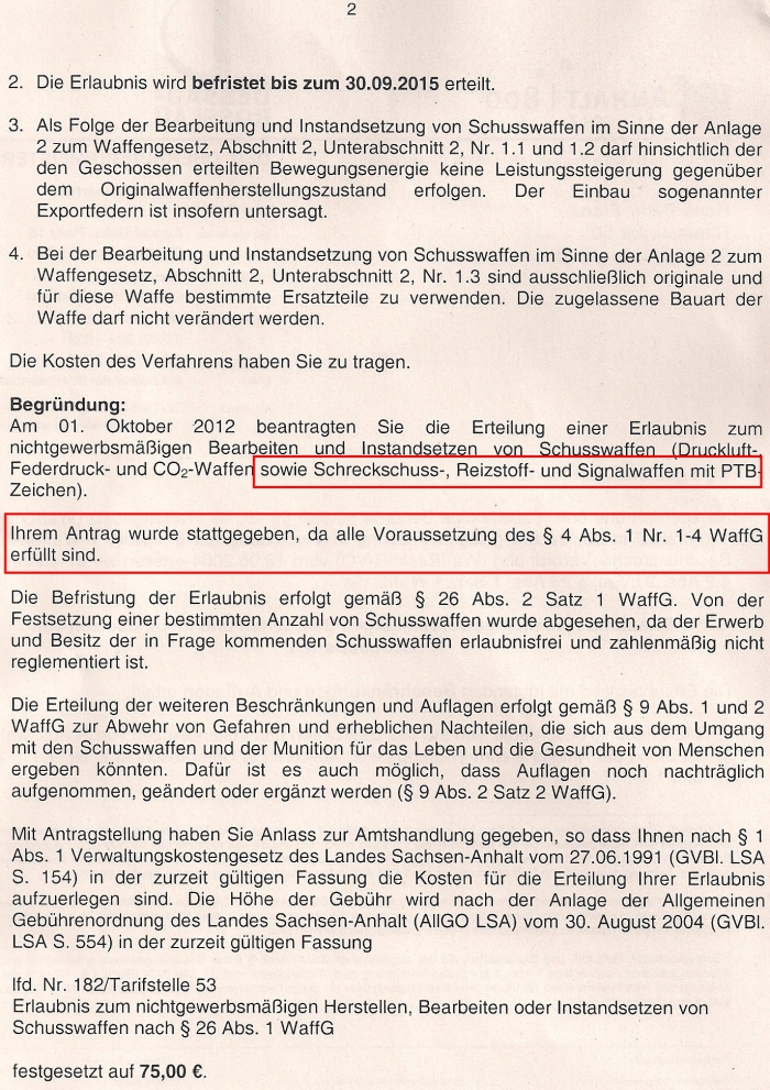 Dokument unten: Behördenschreiben bezüglich einer Verlängerung der Zulassung bei gleichzeitiger Erweiterung der Genehmigung auf die Bearbeitung von Schreckschuss-, Reizstoff- und Signalwaffen mit PTB-Zeichen. Ehrlich gesagt hätte ich niemals erwartet, dass eine Erweiterung auf diesen Waffensektor für eine Privatperson jemals genehmigungsfähig wäre. Das ist m. E. höchst bemerkenswert!