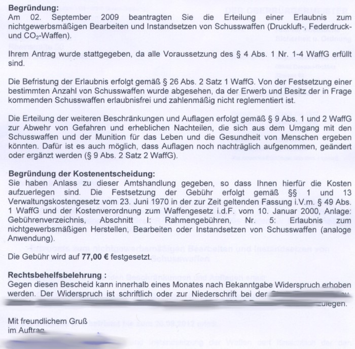 noch unter der (freien) 7,5 J-Grenze bleibt! Wer so etwas trotzdem durchführt, riskiert Strafen und spielt dabei mit seiner waffenrechtlichen Zuverlässigkeit. Dass aber auch die Durchführung reiner nichtkommerzieller Reparatur- und Instandsetzungsmaßnahmen an wesentlichen Teilen einer Waffe der ausdrücklichen behördlichen Genehmigung für den Privatmann bedürfen, ist vielen absolut nicht bewusst. Daher weise ich hier nochmals auf diesen Sachverhalt hin und kann dies mit dem unten gezeigten offiziellen Behördenschreiben auch entsprechend belegen. Also Vorsicht: Schnell hat man sich in die Illegalität gebastelt! Waffengesetzt: § 26 Nichtgewerbsmäßige Waffenherstellung (1) Die Erlaubnis zur nichtgewerbsmäßigen Herstellung, Bearbeitung oder Instandsetzung von Schusswaffen wird durch einen Erlaubnisschein erteilt. Sie schließt den Erwerb von zu diesen Tätigkeiten benötigten wesentlichen Teilen von Schusswaffen sowie den Besitz dieser Gegenstände ein. (2) Die Erlaubnis ist auf höchstens drei Jahre zu befristen und auf eine bestimmte Zahl und Art von Schusswaffen und wesentlichen Teilen zu beschränken. Personen, denen Schusswaffen zur Erprobung, Begutachtung, Untersuchung oder für ähnliche Zwecke, die insbesondere eine Bearbeitung oder Instandsetzung erforderlich machen können, überlassen werden, kann die Erlaubnis nach Absatz 1 ohne Beschränkung auf eine bestimmte Zahl und Art von Schusswaffen und wesentlichen Teilen erteilt werden. Abb unten: Behördliches Genehmigungsschreiben mit beschränkter und befristeter Erlaubnis für die Bearbeitung von CO2-/Druckluftwaffen. Vielen Dank an “H.-P. F.” für die freundliche Überlassung.