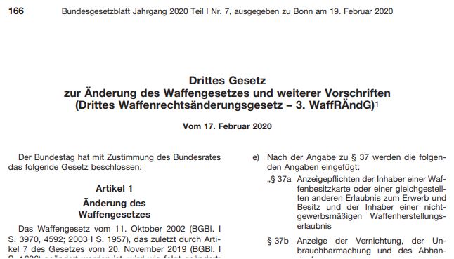 Das neue deutsche Waffengesetz 2020 Am 19.02.2020 wurde das neue Waffengesetz im Bundesanzeiger veröffentlicht und ist damit gültig. Inkrafttreten wird es am 01. September 2020.