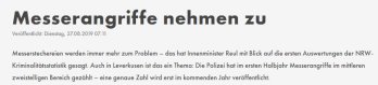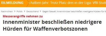 Messer und Waffenverbotszonen: Am bereits heute sehr komplizierten Messer-Erlaubnis- und -verbotsrecht in Deutschland wird sich unter dem neuen Waffengesetz nichts ändern. Aber nicht zu früh freuen, denn es werden neue Regelungen bei den Verbotszonen in Städten greifen. Und die haben es wiederum in sich. Bislang konnten solche Verbotszonen nur in einschlägigen Bereichen eingerichtet werden, die als kriminelle Brennpunkte aktenkundig sind. Zukünftig können die Areas frei nach Schnauze ausgerufen und beschildert werden. So dürfen in den ausgewiesenen Bereichen z. B. nur noch Messer geführt werden, deren Klingenlänge 4 cm nicht überschreitet. Gemessen ab Griff, nicht erst ab der scharfen Schneide! Einhandmesser und Messer mit verriegelnder Klinge sowie viele andere Messertypen sind ja ohnehin bereits außen vor. Ausnahmen soll es neuerdings für Inhaber von waffenrechtlichen Erlaubnissen wie z. B. dem „Kleinen Waffenschein“ geben, da diese ihre für die Erteilung erforderliche Zuverlässigkeit damit beweisen haben. Außerdem gelten für Anwohner und Anlieger solcher Zonen Erleichterungen. Um bei Kontrollen nicht unvermittelt in Probleme zu geraten, sollte jede Person, die ein Messer oder andere „gefährliche Gegenstände“ mit sich führen möchte oder muss, sich mit den komplexen Regelungen in den Verbotszonen befassen. Abgesehen von Messern werden auch andere Gegenstände, die im Grunde nicht das Geringste mit Waffen zu tun haben, willkürlich zu „Waffen“ deklariert. Dazu gehören Pfeffersprays zur Tierabwehr genauso, wie eine mitgeführte Glasflasche. Siehe dazu die Symbole auf Waffenverbotszonenschildern. Und wer wird sich wohl nicht an solchen Verboten stören? … Richtig: Kriminelle. Wer wird drangsaliert und kriminalisiert? … Richtig: Unbescholtene Bürger. Da kann man dem Gesetzgeber nur zurufen: „Thema verfehlt, sechs, setzen!“ Medien-Meldungen wie diese sind es, die den Verbotsaktionismus befeuern und letztlich in Symbolpolitik münden: