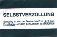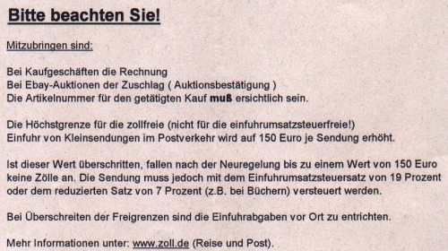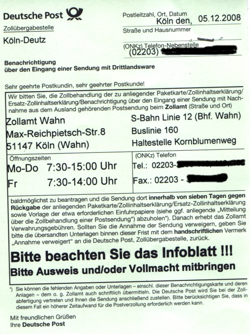 Angebotene Optionen: Abholung innerhalb von sieben Tagen oder Postverzollung: Ich entschied mich, vor allen Dingen wegen der arbeitnehmerfeindlichen Öffnungszeiten, aber auch wegen der nach Rückfrage angedrohten langen Selbstabholer-Wartezeiten, für die Postverzollung, welche über die zentrale Stelle in Speyer (Hauptzollamt Saarbrücken) läuft. Zu diesem Zwecke legte ich alle Dokumente auf’s Faxgerät und übermittelte diese, samt einer Kopie meines auch der Ware beiliegenden o. g. Begleitschreibens, an das Hauptzollamt in Köln. Zwar wurde mir seitens meines Ansprechpartners bei der „Postverzollung“ (Post AG) eine Wartezeit bis zur endgültigen Zustellung von 2-3 Wochen prognostiziert (wohl wegen des erhöhten Paketaufkommens im Vorfeld der Weih- nachtsfeiertage), aber trotz, bzw. wegen dieser Unkenrufe war ich von der letztlich doch schnellen Zustellung sehr positiv überrascht: 26.11.2008 - Paket in USA aufgegeben 05.12.2008 - Datum der Benachrichtigung (HauptZA Köln) über den Eingang der Sendung 07.12.2008 – Posteingang der Benachrichtigung nebst „Customs Declaration“ bei mir 08.12.2008 – Fax ans Zollamt mit den Dokumenten für die Postverzollung 16.12.2008 – Ausstelldatum des Einfuhrabgabenbescheides (HauptZA Saarbrücken) 17.12.2008 – Wareneingang bei mir, mit Abgabenentrichtung an den Postzusteller