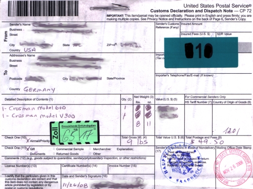 Nach wenigen Tagen war das Luftfrachtpaket in Deutschland beim Zollamt angekommen und ich erhielt per Post eine: „Benachrichtigung über den Empfang einer Sendung mit Drittlandsware“ (so die in feinstem „Beamtendeutsch“ benannte Depeche) mit anliegender „Customs Declaration and Dispatch Note“ des „US Postal Service“.