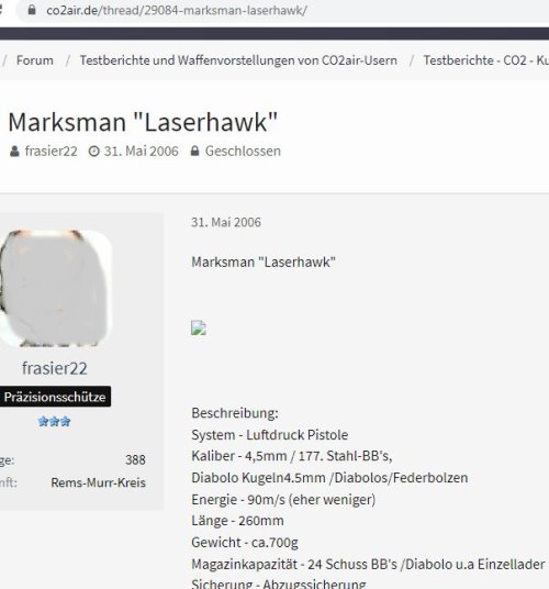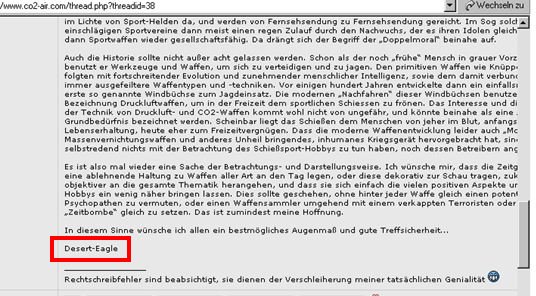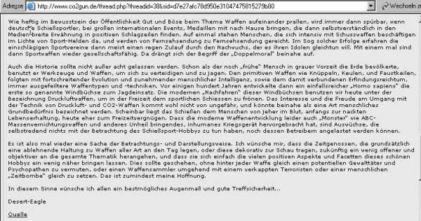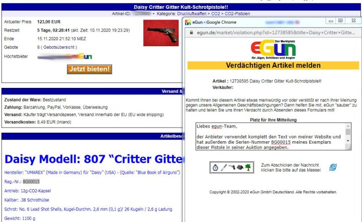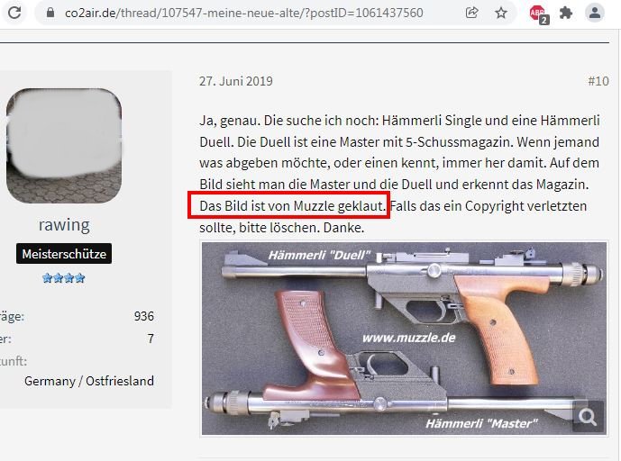 Urheberrechtsverstöße - Bilder- und Textdiebstahl Ich werde von Zeit zu Zeit immer mal wieder freundlich angefragt, ob bestimmte Fotos von meiner Website für ein Projekt übernommen und anderweitig verwendet werden dürfen. In der Regel stimme ich solchen Anfragen zu. Vor allem dann, wenn es sich um eine eng umgrenzte und private, bzw. nicht kommerzielle Verwendung handelt. Als einzige Gegenleistung bitte ich mir dann einen Quellenhinweis aus. Allerdings habe ich bereits viele Verstöße im Netz entdeckt, bei denen Fotos, Textpassagen oder auch ganze Reviews unauthorisiert von meiner Homepage entnommen und auf anderen Präsenzen dreist und ungeniert eingesetzt werden. Selbst wenn dabei hin und wieder auch ein Quellenverweis oder ein Link dazu gesetzt werden gilt: Die Verwendung von Fotos und Textpassagen ist ohne meine explizite Zustimmung von mir unerwünscht und stellt einen Verstoß gegen das Urheberrecht dar. Wer informativ auf eine “muzzle.de”-Seite hinweisen möchte, kann dies jederzeit gerne mit einem Link tun. Natürlich gehören sogenannte “Hotlinks” nicht dazu! Fast regelmäßig, oder zumindest recht häufig, stelle ich solche Verstöße bei der Online-Auktionsplattform “egun.de” fest, ebenso hin und wieder im Diskussionsforum “co2air.de”, u. a.. Bei “egun.de” werden meist die Waffenbeschreibungen mit technischen Daten 1:1 aus meinen Reviews entnommen und per “copy and paste” in die Auktionen eingefügt. Oft macht sich der Warenanbieter nicht einmal die Mühe die Seriennummern meines Waffenexemplars aus dem Text zu löschen oder durch die, der zum Verkauf stehenden Waffe zu ersetzen. Manchmal, bei besonders dreister Vorgehensweise, kommen auch Fotos meiner Waffen zur Verwendung, bis hin zur Wiedergabe eines fast kompletten Reviews als Auktionstext zur Waffenbeschreibung. Kein Scherz! - Oft sind es andere “egun”-Nutzer, die mich per eMail auf diese Umstände hinweisen. Bei “co2air.de”-Forum werden ab und an Fotos von “muzzle.de” in einschlägige Threads eingebunden und von den Moderatoren unwidersprochen dort belassen. Auch hier gilt: Ein Link auf einen Artikel oder ein Foto sind absolut o. k. und von mir sogar gerne gesehen - Das Hochladen und Einfügen meiner Fotos, bzw. die “Hotlink”-Setzung auf Bilder sind nicht in meinem Sinne! Hier besteht der Anspruch auf Exklusivität. Ich denke, das sollte verständlich sein, denn das Erstellen von Reviews mit vielen Fotos und ausführlichen Texten nebst Recherchearbeiten ist eine sehr zeitaufwändige Angelegenheit! Siehe unten...