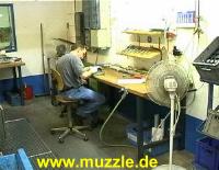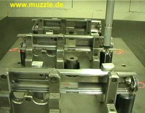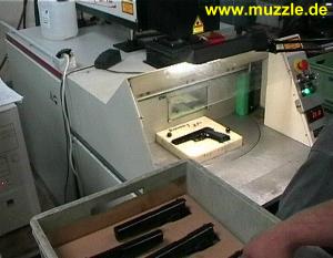 so ist die Einheit definitiv dicht. Nach kompletter Montage wird jede Waffe in eingespanntem Zustand probegeschossen (Bilder unten). Dazu bedient man sich bereits vorgeladener Magazintrommeln, die ebenfalls