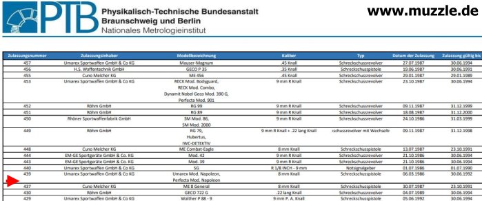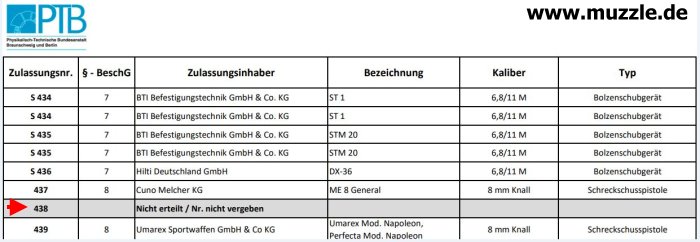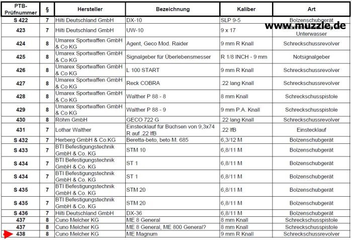 Bundesanstalt” (PTB) hat sich der Eintrag mit der Zulassungsnummer “438” verflüchtigt. Warum ist unklar, vermutlich wohl einfach ein Versehen. Betroffen ist der SRS-Revolver der “Cuno Melcher KG” mit der Bezeichnung “ME Magnum”