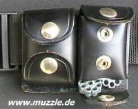 kräftigem Leder hat oben und unten Laschen, die mit Druckknöpfen verschlossen werden. Von oben können je vier vorgeladene 8-schüssige Trommeln (hier UMAREX) in die Ledertasche eingeführt werden, welche innen