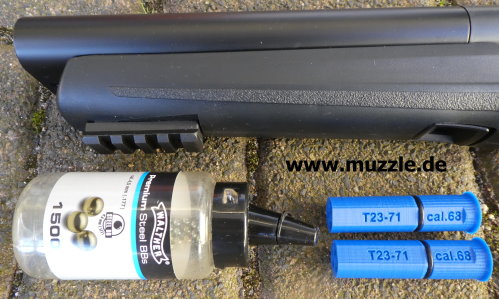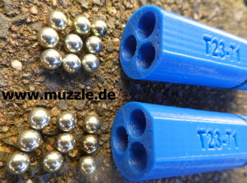 Die “T4E HDS 68” wird vom Hersteller zwar als “Home Defense”-Waffe beworben, allerdings ist das meines Erachtens unsinnig, denn von einer CO2-Waffe die eine Mündungsenergie von lediglich < 7,5 Joule entwickelt, kann man definitiv nicht erwarten einen Angreifer effektiv abwehren zu können. Heim-/Selbstverteidigung also praktisch nicht möglich. Warum ist das so? Die 7,5 Joule-Grenze mit deutscher Kennzeichnung “F” im Pentagon: Nach Erkenntnissen des Pathologen Prof. Karl Sellier, der sich wissenschaftlich mit Wundballistik, Schusswaffen und Schusswirkung, sowie Schussentfernungsbestimmung beschäftigt hat und zu diesem Thema etliche Publikationen veröffentlichte, liegt die Grenze für ernsthafte/folgenschwere Schussverletzungen durch Projektile oberhalb der 7,5 Joule-Grenze. Daran hat man sich beim Waffengesetz (seit 1972) für “Freie Waffen” orientiert. Ergo: Eine Waffe zur Selbstverteidigung haben wir hier nicht, wohl aber eine tolle Fun-/Aktionwaffe für das Plinking auf dem Heimschießstand. Und dafür gibt es jetzt ein interessantes Ladetool aus Kunststoff in Form einer Schrotpatrone. Bezeichnung: “T23-71”. Wie schon der “Slugmaker.688”, stammt auch dieses innovative Zubehörteil aus der Ideenschmiede von Stefan Weber. Homepage www.tech23.de . Das Produkt aus dem 3D-Drucker zum Verschießen von jeweils 9 Stück BBs im Kaliber 6 mm kommt im Doppelpack zum Kunden.