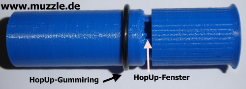 Vor der Laufkaliberangabe auf der Hülse befindet sich ein schwarzer Gummi-O-Ring, der in einer Fuge mit Aussparungen sitzt und die 6mm-Kugeln nach dem Laden hinten hält, sowie den HupUp-Effekt beim Verschießen erzeugt. Begrifferläuterung: Hop-Up = Vorrichtung (z. B. Walzen am Laufansatz) in Softairwaffen, die abgefeuerte BBs in eine Rotationsbewegung versetzt. Das dadurch herbeigeführte strömungsgünstigere Verhalten der Geschosse hat eine stabilere Flugbahn, bessere Präzision und ein größere Reichweite zur Folge.