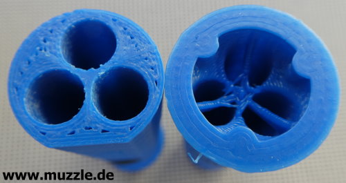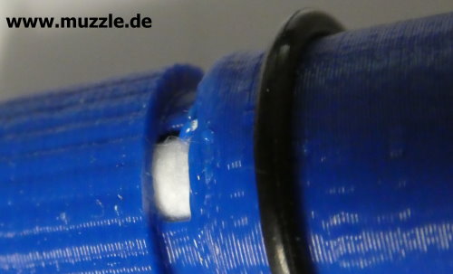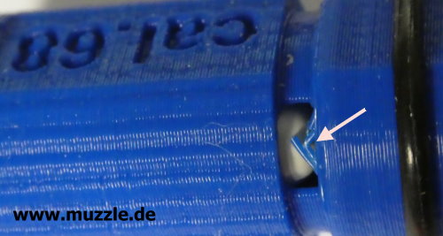 Hinweis: Bei den beiden mir vorliegenden Hülsen habe ich festgestellt, das Materialgrate (siehe weißer Pfeil im Foto unten) in den Aussparungen verhindern, dass der Gummiring sauber in die “HopUp”-Fenster greift. Dadurch wir die “HopUp”-Funktion beeinträchtigt bzw. verhindert. Es empfiehlt sich, vor dem ersten Gebrauch der “Nineshots” den Gummiring zu verschieben und die Öffnungen der Fenster zu kontrollieren und bei Bedarf frei zu machen.