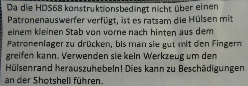 Die Hülsen werden wie echte Schrotpatronen in den Lauf geladen. Dabei muss die abgeflachte und beschriftete Seite der Shot Shells nach oben weisen (Bilder unten).