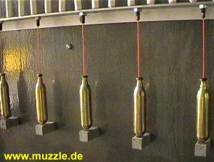 Die an Schnüren aufgehängten CO2-Kartuschen (Fotos unten) geraten bei einem Treffer kurzzeitig ins
