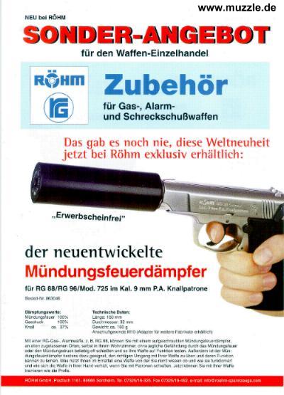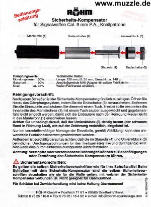 Die Reinigung des Kompensators ist nach jeder Benutzung empfohlen, gestaltet sich aber sehr komfortabel, da er leicht zerlegt und wieder zusammengebaut werden kann. Dies nicht zuletzt wegen der einfachen und funktionellen Bauweise. Eine ausrangierte Zahnbürste tut da z. B. hervorragende Dienste. Anmerkung: Mit aufgeschraubtem Kompensator können im Verteidigungsfalle Gas- oder Pfefferpatronen nicht wirkungsvoll verschossen werden. Ebenso wird der möglicherweise den Angreifer abschreckende Schussknall und das Mündungsfeuer maßgeblich reduziert, bzw. verhindert. Fazit: Für einen Notwehrfall ist der Kompensator somit ein keinesfalls geeignetes Zubehörteil, da die Waffe damit nebenbei auch schwerer und deutlich sperriger ist. Das Wirkungs- und Bedrohungspotential einer Gas-/Schreckschusswaffe wird durch die Verwendung des Kompensators also drastisch gesenkt, respektive zunichte gemacht. Er ist ausschließlich zum realistischen Schusstraining oder für Funktionstests mit Platzpatronen geeignet und für diese Bestimmung ein empfehlenswertes Gerät. Es gilt aber dabei die gleichen Sicherheitsregeln zu beachten, wie bei der Verwendung einer Schreckschusswaffe ohne aufgeschraubten Sicherheitskompensator. GUNIMO Dezember 2002 Vielen Dank an die Firma “Röhm” für die freundliche Unterstützung.