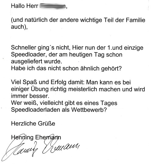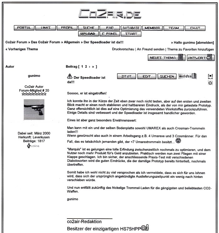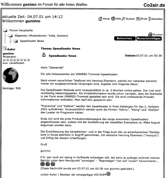 Ich hätte diesen einige tausen Mark teuren Prototypen gerne gleich dabehalten, was natürlich leider nicht möglich war, da ihn sein Erfinder nicht aus den Augen ließ. Henning Ehemann versprach einen Verkaufsstart seines Produktes im Sommer diesen Jahres. Das Warten hat also bald ein Ende. Vermarktet wird der Schnelllader über die einschlägig bekannten Ausrüsterfirmen, da bisher niemand die Bedingungen für einen Exklusiv-Vermarktungs-Vertrag erfüllen wollte oder konnte. Der Verkaufspreis soll wohl bei etwa 30 € angesiedelt sein. Ich habe mein Exemplar gleich an Ort und Stelle beim Erfinder geordert. Bis zum Erhalt, heisst es also weiterhin die Fingerfertigkeit zu trainieren. GUNIMO März 2001
