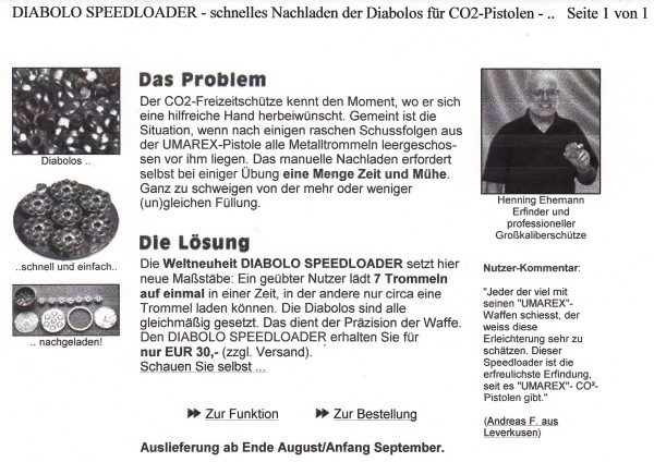 Hinweis: (05/2002) Das mittlerweile fertige und ausgereifte Produkt kann unter www.diabolo-speedloader.de geordert werden (€ 32,25). - Prädikat: Sehr empfehlenswert. - So eignet sich der Lader nun auch für die Trommeln der Marken “Crosman” und “Gamo”.