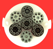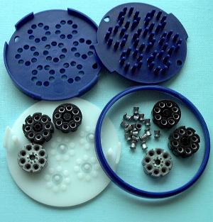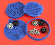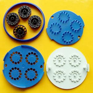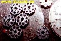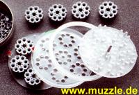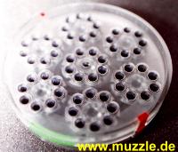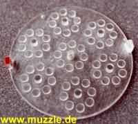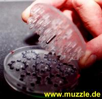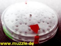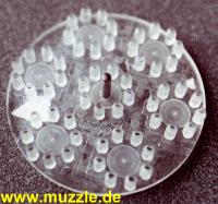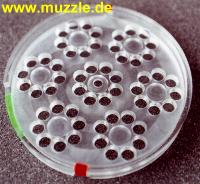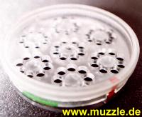 Das Produkt besteht aus vier Einzelteilen, die durch einen mittig angebrachten Metallstift am Deckelsegment zentriert sind. Der Prototyp ist aus transparentem Kunststoff gefertigt, und hinterlässt einen recht soliden Eindruck. Alle Teile können nur auf einem einzigen Weg zusammengefügt werden, sodass Fehlbedienungen praktisch ausgeschlossen sind. Die runde Form, unwesentlich grösser als eine Diabolodose, ergibt sich aus der praktischsten Anordnung der sieben Trommeln, die zu befüllen sind. Zunächst bestückt man die untere Lage des Loaders mit den leeren UMAREX-Trommeln. Diese werden, mit der Transportrastung nach oben, jeweils auf einen Führungsstift (Achse) und die acht Splinte gesteckt, die in die Trommelbohrungen greifen und gleichzeitig auch die Eindringtiefe der Diabolos begrenzen. Auf das bestückte untere Segment wird nun eine Art Sieb-Schale aufgesetzt, die überall dort Löcher hat, wo die Diabolos sich in die Trommelöffnungen setzen sollen. Praktischerweise besitzt diese Schale auch eine Grün gekennzeichnete Auslassöffnung am Rand, aus der man die überzähligen Diabolos später leicht wieder herausschütten kann. Zunächst erfolgt aber der Schritt des Befüllens. Auf den Rand dieses Siebes wird nun ein Begrenzungsring aufgebracht, der die Auslassöffnung verschließt, und verhindert, dass Diabolos herausrollen. In die Sieb-Schale wird jetzt eine adäquate Menge Diabolos (Augenmaß) gefüllt. Diese werden durch schüttelnde und kreisende Bewegungen dazu veranlasst, sich in die vorgesehenen Öffnungen zu setzen. Man sollte unbedingt vermeiden, den Speedloader dabei anzuheben, weil die Teile nicht fest miteinander verbunden sind. Nach kurzer Zeit steckt in jedem Loch ein Diabolo, und dies traumwandlerisch sicher, mit der richtigen Seite voraus! Nun ist der Moment gekommen, in dem die überzähligen Diabolos aus dem Sieb ausgeschüttet werden. Nachdem der Begrenzungsring wieder abgenommen wurde, greift man den Speedloader an den rot markierten Stellen, und schüttet über die grünmarkierte Auslassöffnung die Diabolos in die Blechdose zurück. Jetzt kommt das 4. und letzte Teil des Speedloaders ins Spiel. Damit werden die Diabolos fest in die Trommelbohrung gepresst und sitzen dann alle gleich tief in ihren Lagern. Dies geschieht mittels einer Scheibe, die auf der Unterseite mit 56 konisch zulaufenden Zapfen ausgestattet ist. Diese sind einige Millimeter lang. In der Mitte befindet sich ein Zentrierungsstift aus Metall. Auch dieses letzte Bauteil kann nur in einer möglichen Position aufgebracht werden. Sitzt es richtig, so wird es mit sanftem Druck per Handballen belastet, sodass die Diabolos mittels der, als Stößel fungierenden Zapfen, in die Trommelkammern gedrückt werden. Mit wenigen Handgriffen wird der Speedloader nun wieder in seine Einzelteile zerlegt und gibt dabei die sieben fertiggeladenen Trommeln frei, die in einem Bruchteil der üblichen Zeit bestückt sind. Jeder der viel schiesst mit seinen „UMAREXEN“, der weiss diese Erleichterung sehr zu schätzen. Dieser Speedloader ist die erfreulichste Erfindung seit es UMAREX-CO2-Pistolen gibt!