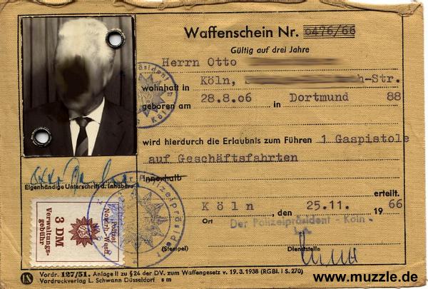 Waffenschein" für Gaswaffen. Das ist jedoch ein ganz “alter Hut”! Schon 1966 hat die Stadt Köln offenbar Waffenscheine für Gaswaffen ausgestellt. Sogar eine Beschränkung bzw. ein Bedürfnis wurde angegeben: "Führen auf