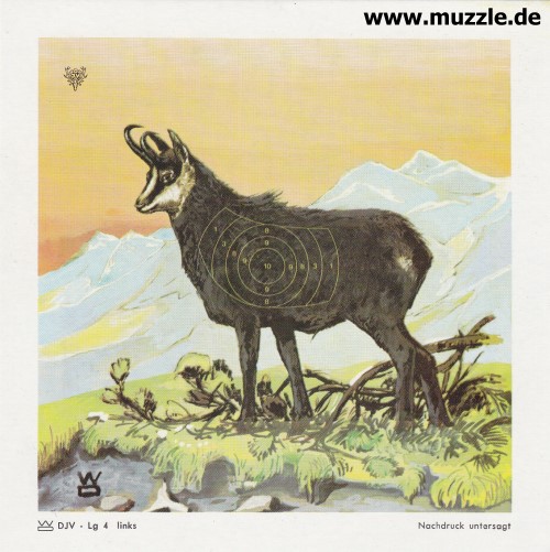 Bild unten: “Hirsch-Scheibe”, Karten-Maße: B=13 cm, H = 14 cm, Trefferzone Durchm. 10 mm. Herkunft