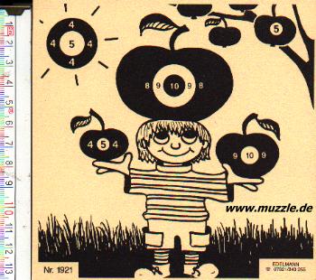 “Daisy”-Fun-Zielscheiben: Apfel, Dose, Baum. Außendurchmesser der Scheibe = 110 mm.