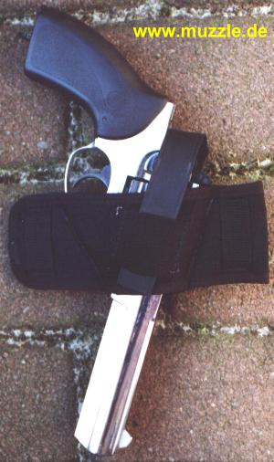 kann. Der Sicherungsriemen ist mit einem starken Klettverschluss befestigt, sodass das Holster an die gängigen Waffenmodelle angepasst werden kann. Es ist somit für Pistolen und Revolver gleichermaßen geeignet. Der